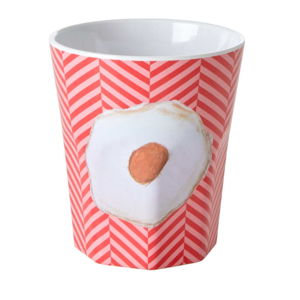 Questo bicchiere di dimensioni più grandi rispetto al classico è perfetto per bevande calde, gelato, come portapenne o quello che più ti viene in mente. Colorato con un pattern a righe con l'immagine di un uovo fritto