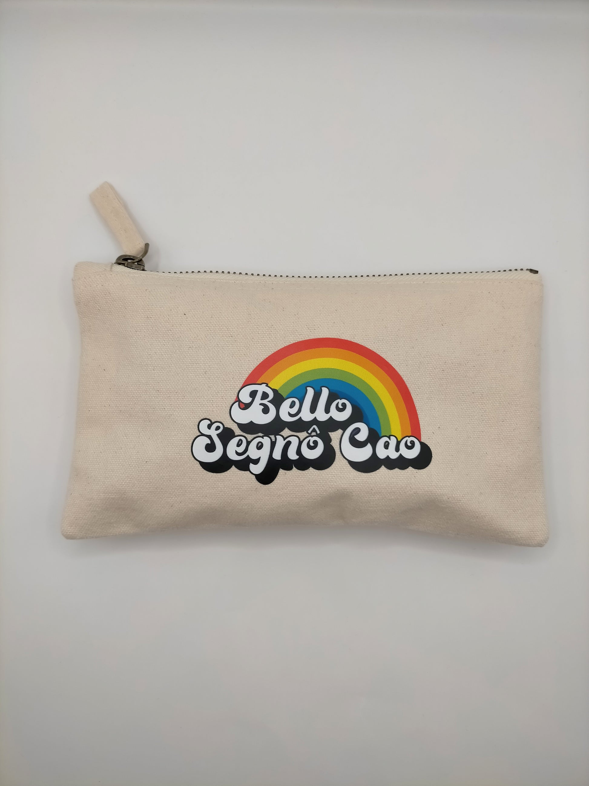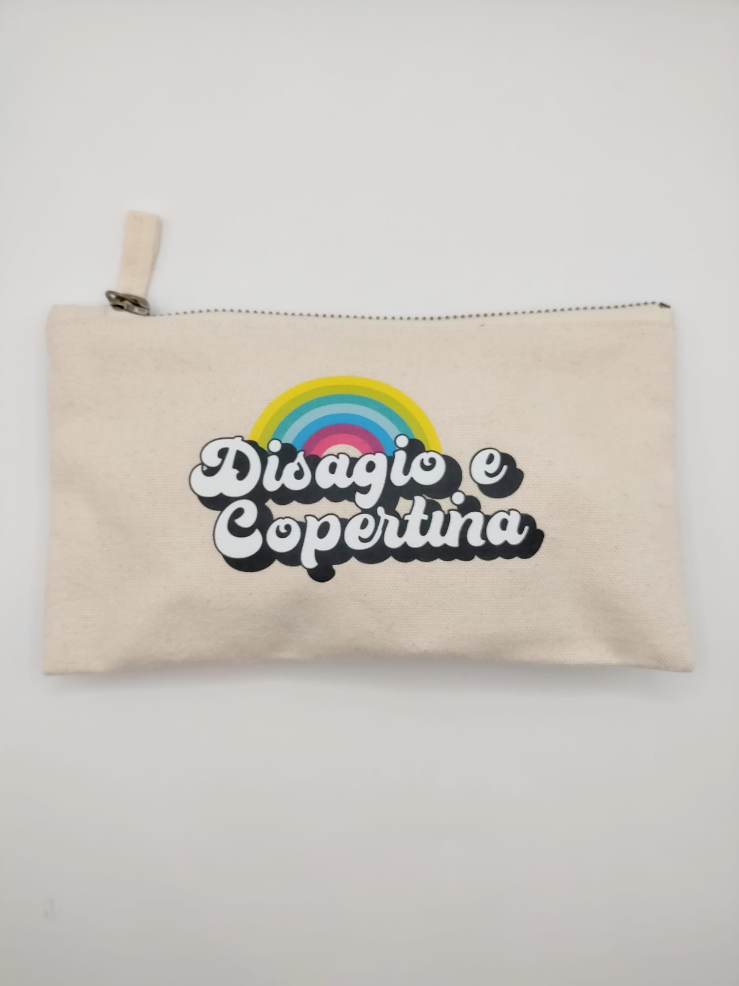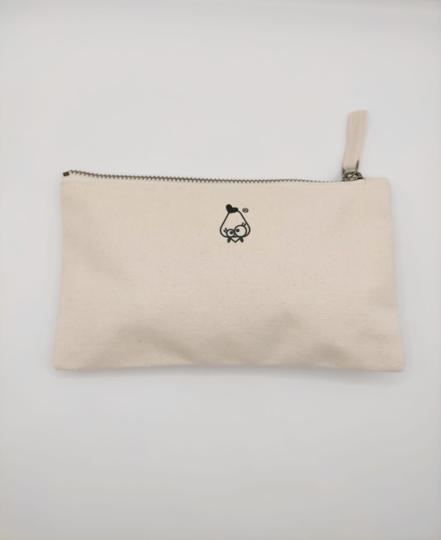 Bustina con stampa di design e frasi originali, in cotone naturale e fondo piatto. Chiusura a zip.
