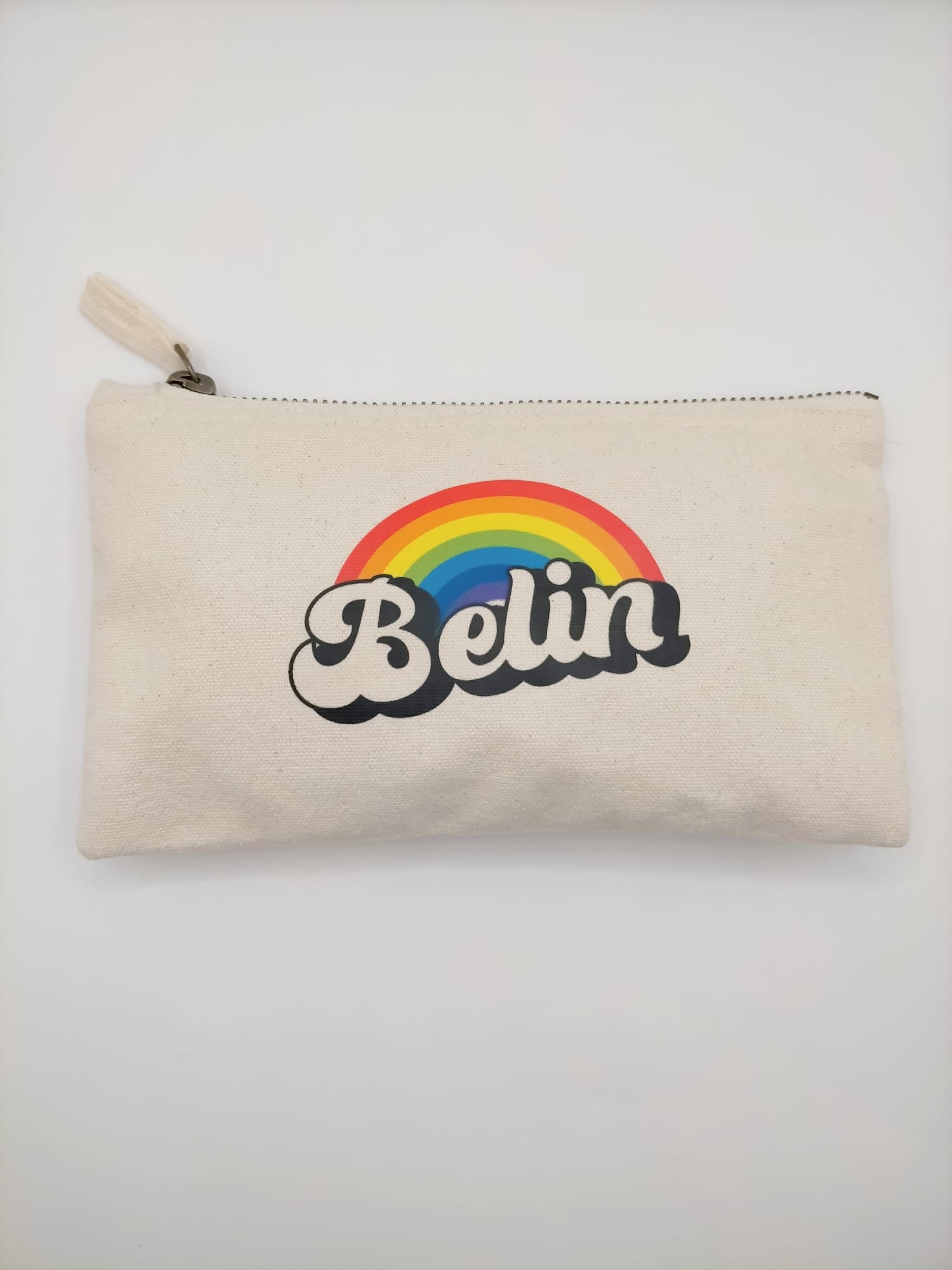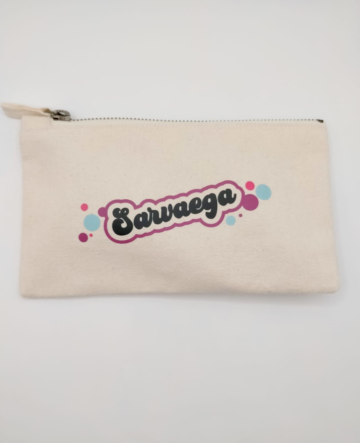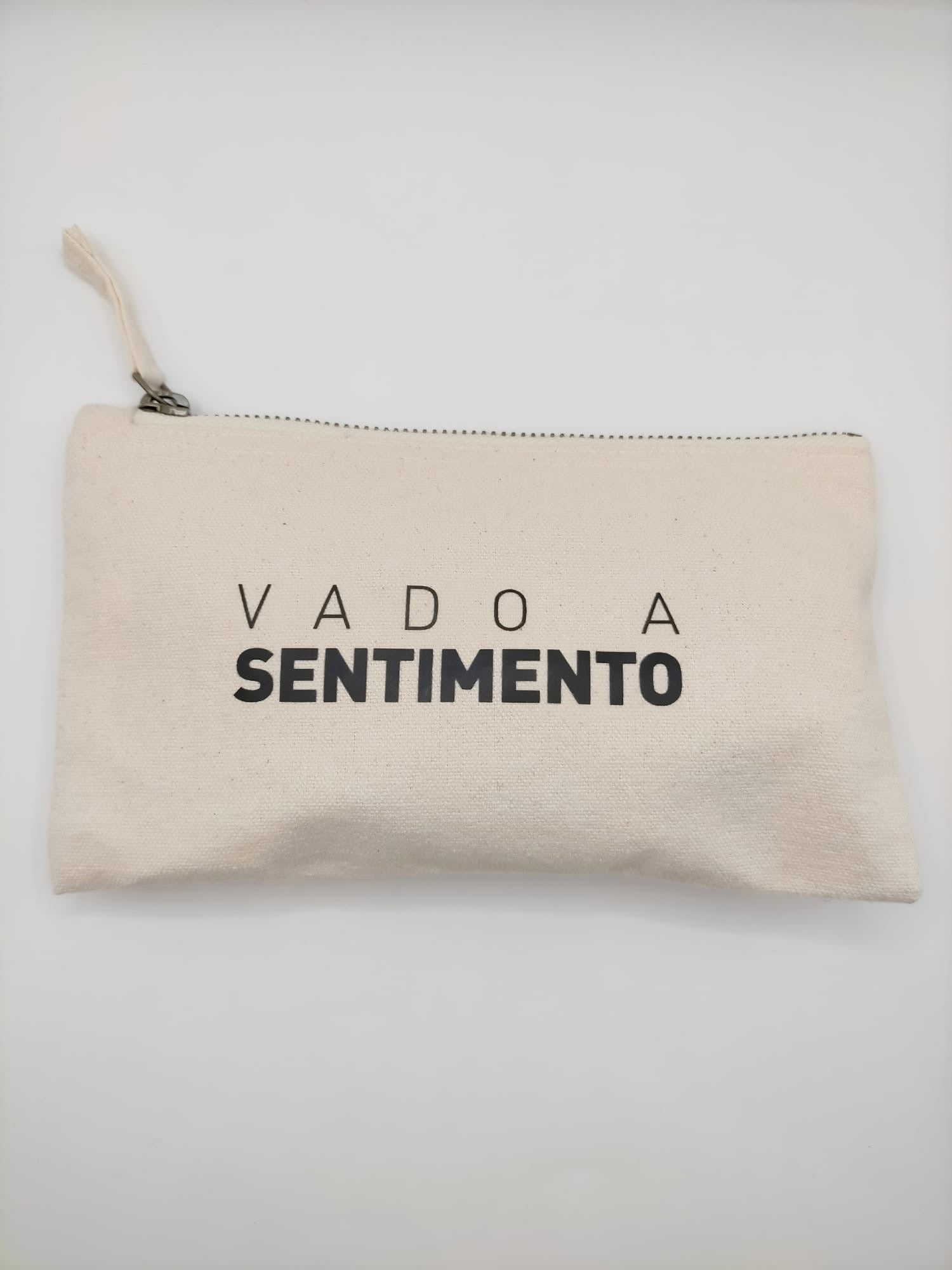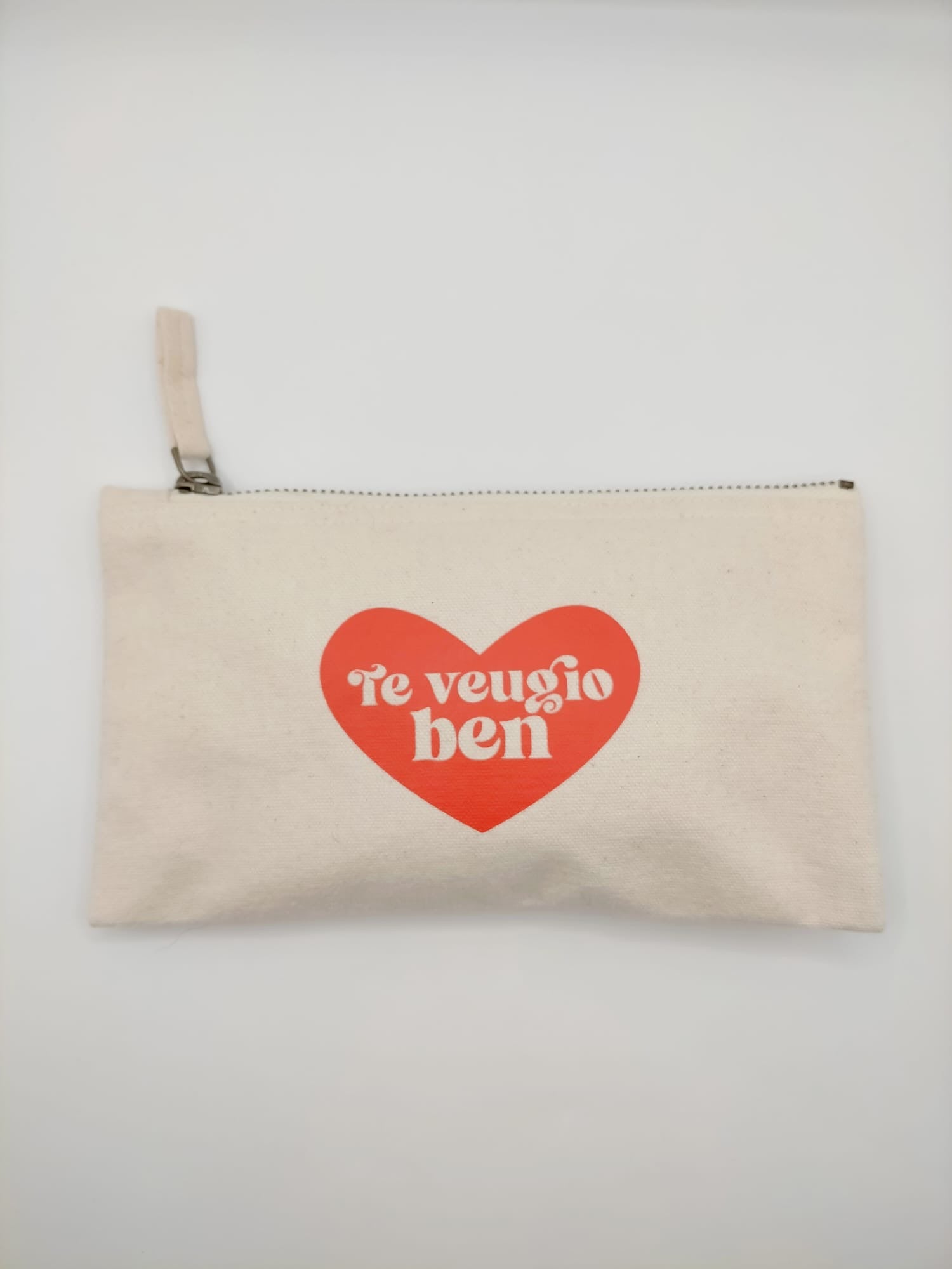 Bustina con stampa di design e frasi originali, in cotone naturale e fondo piatto. Chiusura a zip.