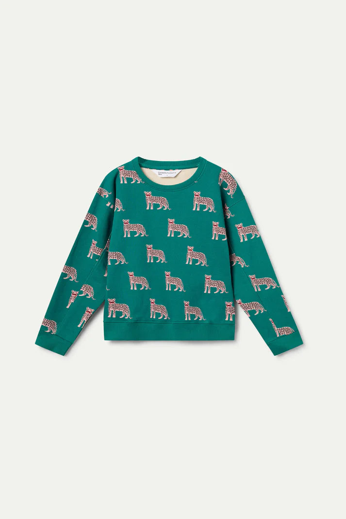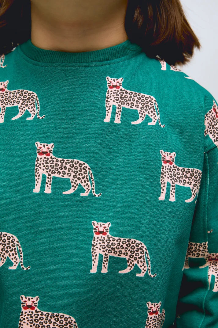 Felpa Onca realizzata in 100% cotone, con stampa di un giaguaro su sfondo verde smeraldo. Con un girocollo e polsini a coste in stile felpa.