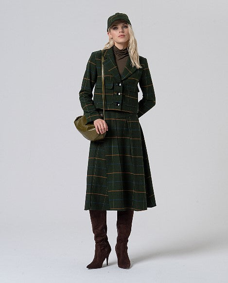 Gonna midi tipo kilt in tessuto scozzese, con pieghe anteriori e fibbia in laterale in ecopelle. Chiusura con zip a scomparsa sul lato.