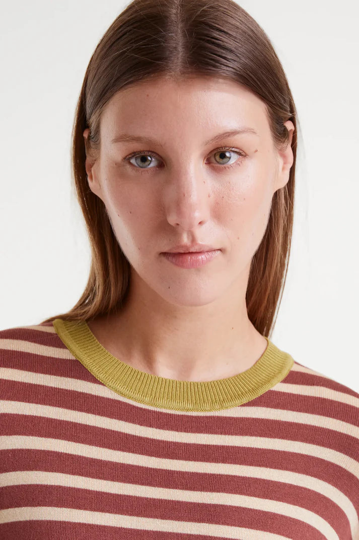Maglione lavorato a maglia a righe marroni e bianche. Con scollo rotondo a contrasto verde lime, maniche lunghe con spalle leggermente scese e finiture a coste.